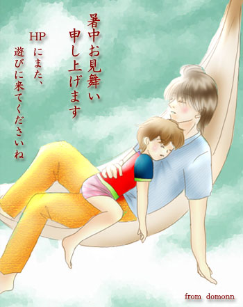 《コメント》 父と子のほのぼの……いいなァ…。 建築探偵新刊発売前に好いものを戴きました。 ハンモックに揺られて、どんな夢を見ているんでしょう。 綿菓子のような夢だと良いですね。 『原罪の庭』234頁の京介の台詞が胸に染みる、 そんな絵だと思います。
