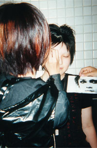 メンバー集合前の一枚。 潤の眉毛メイクを亜聖様に入魂中。 わかりにくーいけど亜聖様眉毛全剃り(!) つーか右隅の潤なまら怖い(※なまら=北海道弁で「すごく」「とても」といった意味)