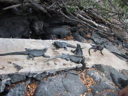 リクイグアナは、ウミイグアナに比べて肉や皮が珍重されたため、個体数は少ない。