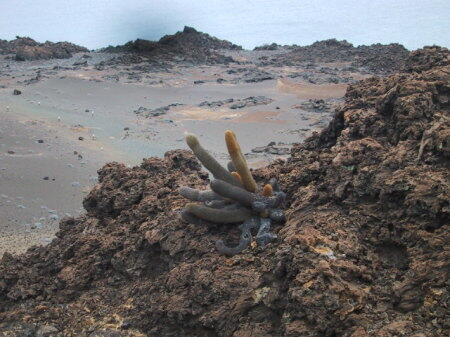 写真のような原始的なサボテンの他、ウチワサボテンは、ゾウガメやリクイグアナの大好物。 |