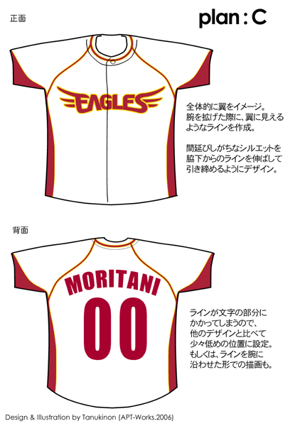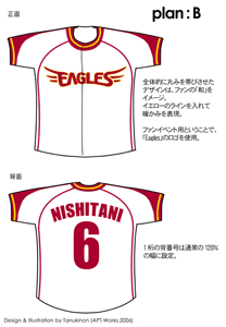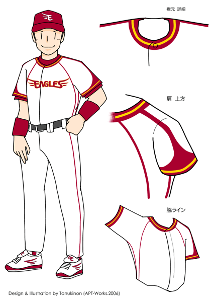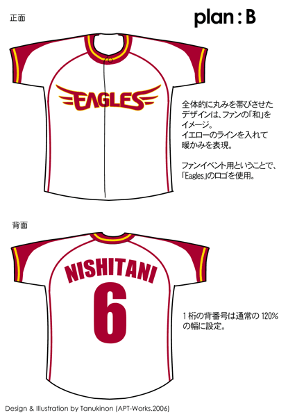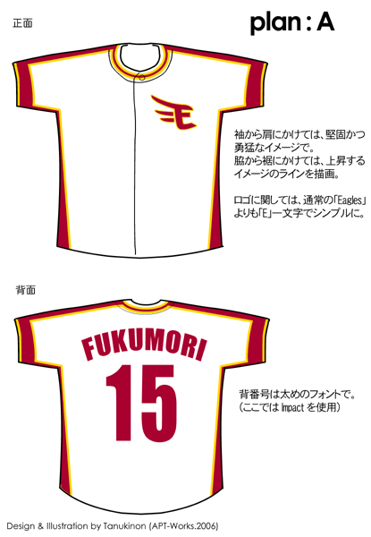 | ファン感謝イベントに絡んだ、ユニフォームデザイン募集に出したネタ。 ボツとなったのでこちらで展示ですw デザインの権利は私にあるので、無断転用禁止でやんす。鷲ロゴ入ってるしw |