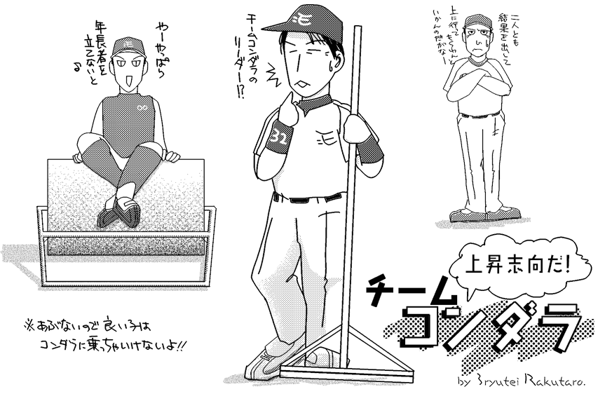 | やっちまいましたよ、チームコンダラ。 もともとは、森谷選手がブログを開設したその日に1軍登録抹消になったという話から始まります。 「練習では目に火を出しながらコンダラ引きまくるで!」 という記事がありましたが、その冒頭を沖原選手ブログの記事から丸パクリしたという内輪的展開が。 そして、そのコンダラを沖原選手が丸パクリ返ししたという……ファン的に大ウケしていたんですがね。 いつのまにかチームコンダラが結成され、リーダーが決まったようですw それが縁なのかどうなのか、お二人はけっこう仲良しさんのようでスよw 7月28日のイースタンの試合で、三塁打を打った森谷選手をベンチでおっきーがハイタッチして迎えるとかね。 そーいう様子を見ていると、ついついこういうネタを描きたくなっちゃうわけなんですそうなんですふぇるなんです。 |