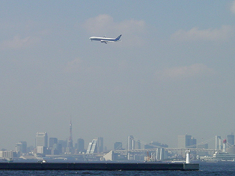 城南島 別の場所で 有料駐車場は端っこの方で、その辺りは行ったことがなかったのですが見てみると結構眺めも良く、また違った風景で撮影する事ができました。 霞んではいますが、レインボーブリッジに東京タワー。高層ブル街の上空を飛ぶANAは、普段は完全に機体Onlyでしか撮らない主義の私でさえ、風景も込みでつい撮ってみたくなる構図でした。 |