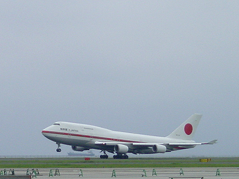 慣熟に飛び立つ瞬間 小泉さんの首相初の日長首脳会談のために前日慣熟に旅立つ政府専用機。デジカメで、しかも金網の網目から撮るのは至難の業! これもこの「上がる瞬間」が撮れただけ運が良かったのかもしれません。撮り慣れてる人はデジカメでももっとずっと上手いとは思いますが・・。 |