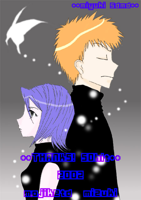 えーーーっと…。 こんなものでいかがでしょうか…? 背景の都合上気づけば白揚羽になっちゃってました; そしてイチルキと言ってよいのか分からぬ程の甘くなさ。 私にはイチルキでなく[一護とルキア]しか描けないようです。(汗) しかし単純な絵の癖して非常に手間の掛かった作品でもありますv 一護の髪が!!!(最強) みゆきさんに限り、煮るなり焼くなり髭を描くなりお好きにどうぞ〜。 精進いたします!!! リク、有難う御座いました!!
