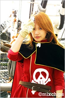 知人のCDロムに参加させていただいた時に船撮影をするから、ということで丁度金髪だったし、はたと選んだものがエメラルダス。いやーレトロ宇宙海賊ども大好きです!!友人にハーロックをやらせるつもりが衣装の関係でだめになったり・・・しょぼん。ほかのロム出演の皆はモー娘とかやってんのに私ひとり濃っ!!!!