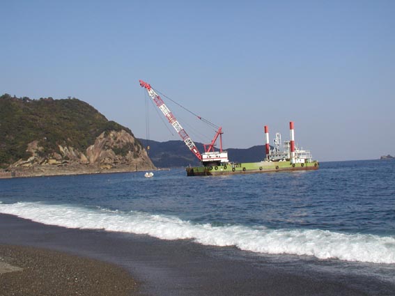 熊野灘という外海での施行が可能かの実験にも2ヵ年を要した大事業である。海岸にテトラポットを置く工法では浜がやせるのを促進することになる。