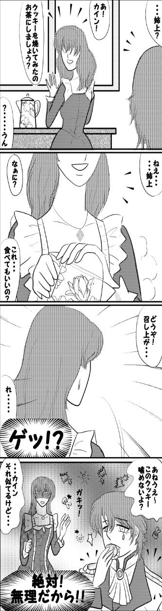 ・・・すみません、カインのマントを留めている飾り?が余りに食べ物に似ていたものでつい(汗) ホントは月餅に見えたんですが(あのテカリ具合が特に)王宮世界に月餅は無いだろう?・・・と止めました。 可憐な王女には、やっぱりクッキーかと♪