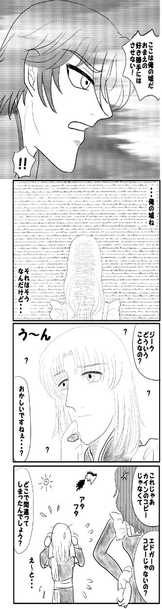 管理人は(俺)カインをプレイした後でエドガーをプレイしたんですが・・・ 台詞・・・被ってる?・・・って思ったのは管理人だけ?(汗) ・・・俺様キャラは苦手・・・・・ 何でこんな高ピーな子に・・・(涙)