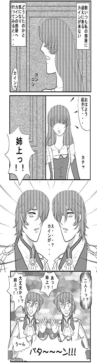 え〜続きます(汗) コチラの4コマは連作になる予定・・・多分。 シリアスネタで普通の漫画にしようと思ったんです・・・が! 小話が暗いのばっかなんで4コマっていったら笑いだろう?と4コマになりました。 笑えるオチが付けれるのか?・・・不安だ(沈)