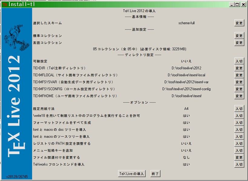 すると、GUIのインストール設定画面が現れます。適宜変更を行ってください。私の場合はインストール場所を「D:\tool\texlive」以下に変更しました。