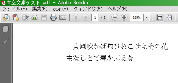 D:\TeXに「test1.pdf」が出来ると思います。それを開いて「東風吹かば匂ひおこせよ梅の花(改行)主なしとて春を忘るな」と表示されていれば成功です。