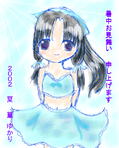 ゆかりさんから暑中のお見舞い頂きました♪このイラストを見てるとホントに涼しくなりますよねー配色ってゆーのかな、そんなのがイイカンジです。まんまるぷにぷにらぶーv黒髪もコオリ内ではポイント高いのデスヨー(笑