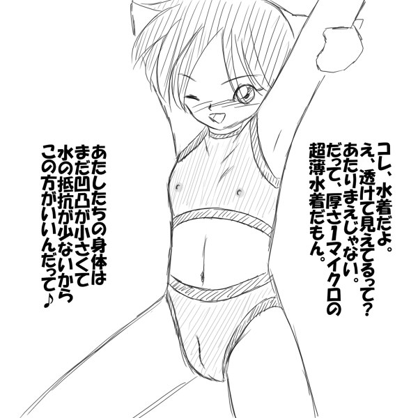 超薄型水着を着た女の子です。 厚さわずか1マイクロの極薄生地……なんて本当にあるのでしょうか? 当然、隠したはずのところも全部透けて、さらにその凹凸までもが全て露になります。 さぞかし、水の抵抗が少ない水着になることでしょうね。