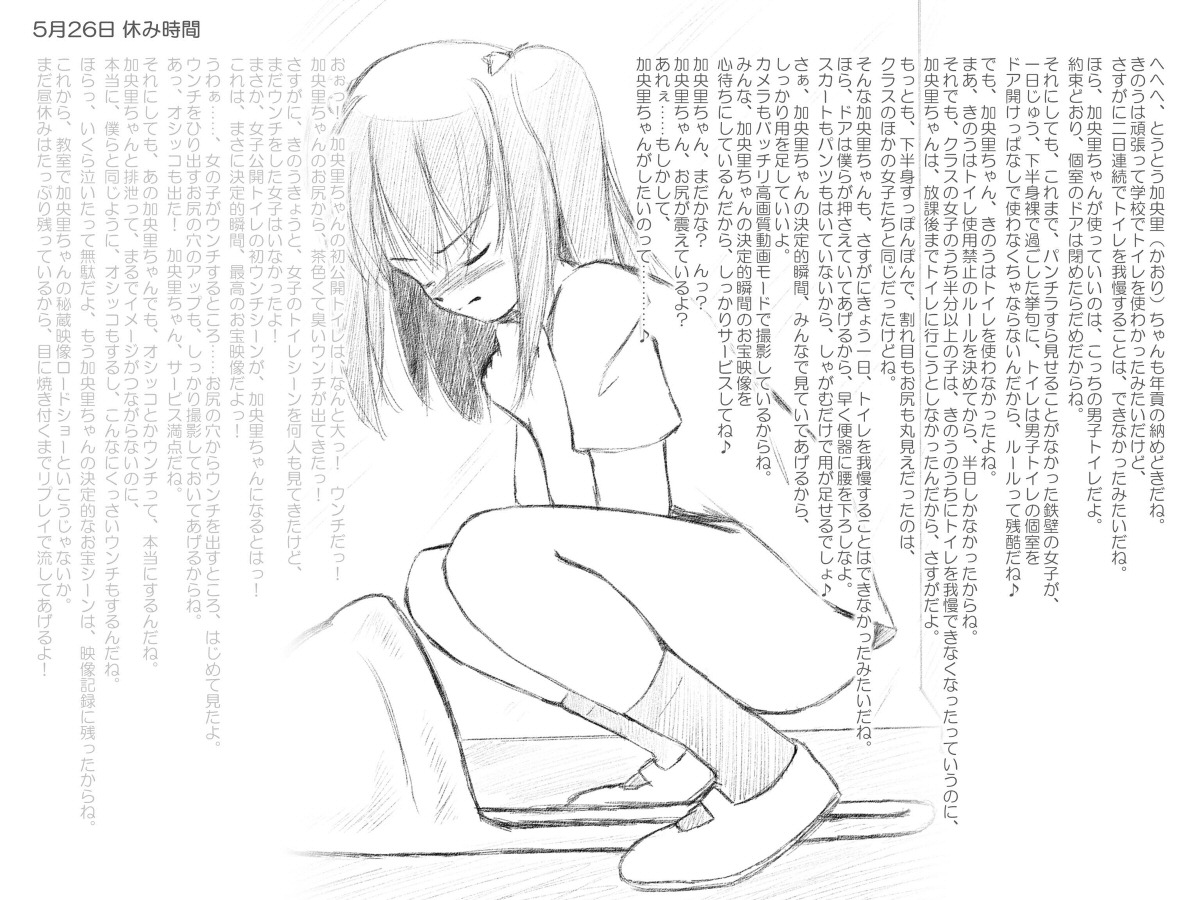 | 5年1組のクラスでは、男女対抗リレーで女子が敗北を喫したその日から夏休みまでの間、女子は学校にいる間、常に下半身裸でいることを強いられることになった。 女子たちは全員、女の子の割れ目を晒しながら自分のパンツの染みを広げて露にした姿を写真に撮られ、決定的な弱みを握られて、男子たちの言いなりになることを誓わされた。 そして、女子たちへの恥辱ルールはトイレの使い方にまで及んだ。 クラスの女子は、学校では男子トイレを使うこととされ、女子トイレの使用は禁止。 女子がトイレを使うときは、必ず個室のドアを開いたままにすることとし、当然のことながら施錠は禁止となった。 決して他人には見せてはいけない……知られてはいけない女の子の最大のプライバシーを暴いてしまう、この無慈悲なルールに……しかし女子たちは逆らうことは許されない。 そしてそれは、これまでの学校生活でパンチラひとつ見せることなく、羞恥からはもっとも縁遠いと思われていた加央里(かおり)にも、平等に降り注ぐこととなった。 女子の敗北と服従の誓いとともに、全女子生徒が汚パンツ晒しをさせられた翌日……、早くも加央里は絶体絶命の状況に置かれることになった……。 ![]() ![]() |
