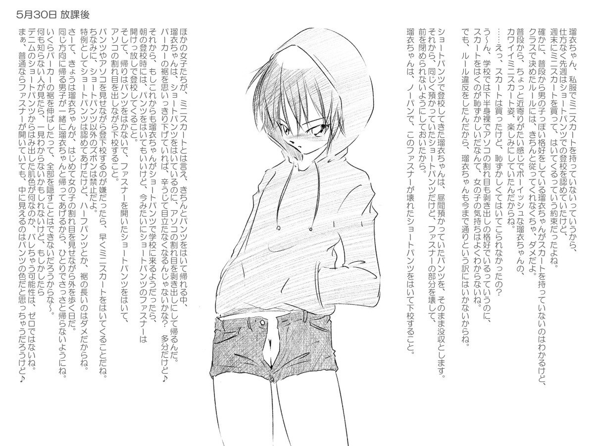 | 男女対抗リレー勝負に負けた日から、5年1組の女子は、夏休みまでの間、男子たちの言いなりになることを誓わされた。 そして、学校では下半身裸でいること、トイレは男子トイレを使い個室のドアを開けたままで用を足すことなどが決められるとともに、女子は必ずミニスカートをはいて学校に来るようにという約束もさせられることになった。 しかし、中には普段からスカートを身に着けておらず、ミニスカートを持っていない女子も存在した。 猶予期間として、週末にミニスカートを買って着てくるように……ということになっていたのだが、週が明けた月曜日、ミニスカートをはかずに登校してきた女子がいたのだった。 ![]() |