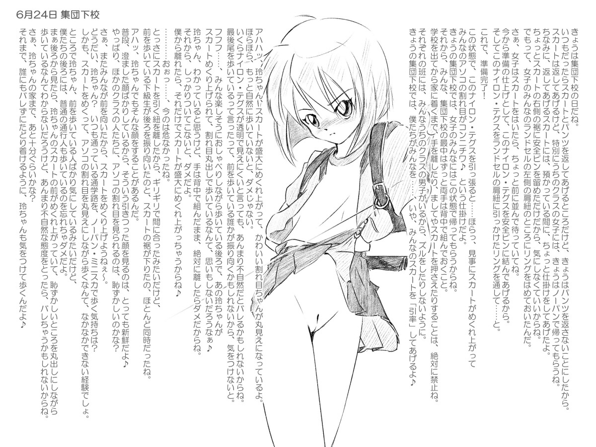 | 男女対抗リレー勝負に負けた女子は、夏休みまでの間、男子たちの言いなりになることを誓わされ、夏休みまでの間、学校では下半身裸でいることを約束させられた。 本来であれば、放課後にスカートとパンツを返却され、ようやくその日一日の辱めから解放されるはずの女子たちだった。 しかし、月に一度の集団下校の日……彼女たちはスカートは返してもらえたものの、パンツは返されることはなく、ノーパンで下校させられることになった。 集団下校は、それぞれ近所の家同士で集まって下校する行事であり、他のクラスだけではなく、他の学年の子たちも一緒に集まって歩いていくことになる。 そんな中、5年1組の女子たちは、スカート一枚だけのノーパン状態で帰宅することを命じられたのだった。 ![]() |