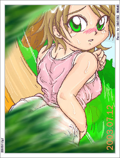 真夏のまぶしい海辺で、かわいらしい水着を身にまとった女の子。 水着の布の境目が、微妙なところを通過していて、恥ずかしいところがくっきりと浮かび上がっていますね。 ちなみに、もうひとつちょっと日焼けした別バージョンもいただきました。 いなつきほなみさん、きれいな暑中御見舞いCGを贈っていただき、ありがとうございます。 |