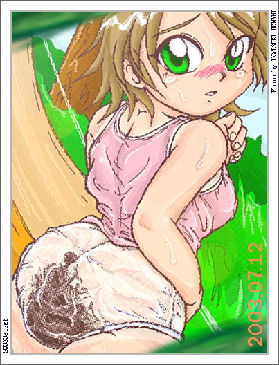 またまたスナップ写真風CGで贈っていただきました。 モデルは希。 これは、林間学校3日目のワンシーンですね。 林間学校の3日目、便意を催してしまった女子生徒は、先生にオムツをつけてもらって、立ったままで排泄しなければなりません。 どうやら、オムツに履き替えさせられた希は、恥ずかしさからか、草むらに逃げてしまったようですね。 そしてその草陰で排泄したところを、パシャっと写真に収められてしまいました。 でも、希が逃げ出したのには訳があります。 さらに近くから写した写真には・・・そこには、透明なオムツの中に、大量のウンチを溜めた希の姿が・・・。 そう、この林間学校3日目のオムツは、何回かに1回の割合で、透明ビニールオムツが用意されてしまうんです。 そして、たまたまその透明オムツに当たってしまった希。 当然、恥ずかしい排泄シーンも、そしてその排便の跡すらも、何一つ隠すことができませんね。 顔を真っ赤にして、涙まで浮かべて恥じらう希。 でも、そんな姿さえも、卒業アルバムの中で思い出のワンシーンとして使われてしまうんですね。 いなつきほなみさん、またまた、すばらしくかわいい、そしてエッチなCGを贈ってくださり、本当にありがとうございます。 |