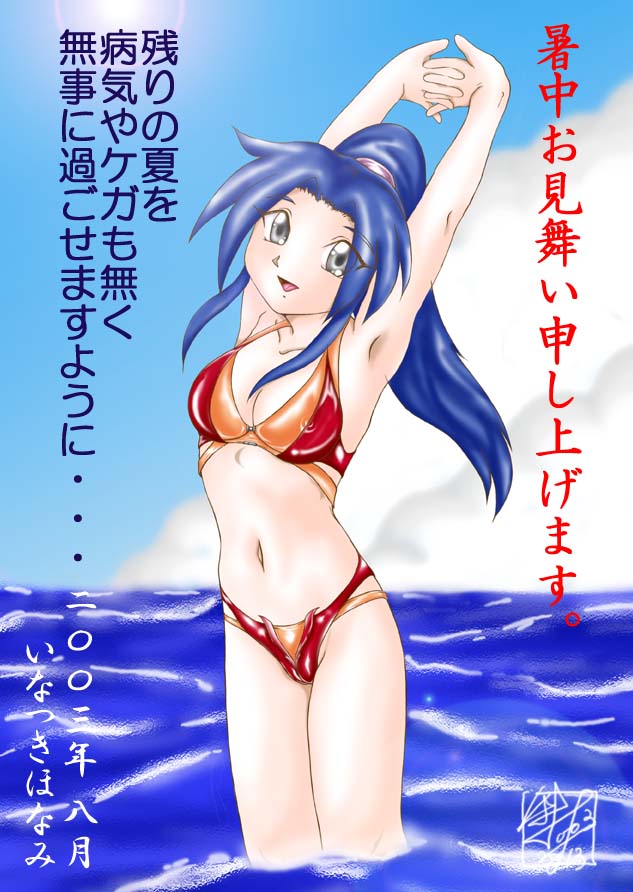 海辺できれいな水着に身を包んで、みんなの健康と安全を笑顔で祈ってくれています。 でも、このCGいろんなバリエーションが用意されていて・・・このペイントタイプとか・・・あとやっぱり、全裸タイプとか・・・いいですねぇ(笑) いなつきほなみさん、かわいらしい暑中御見舞いをいただき、ありがとうございます。 |