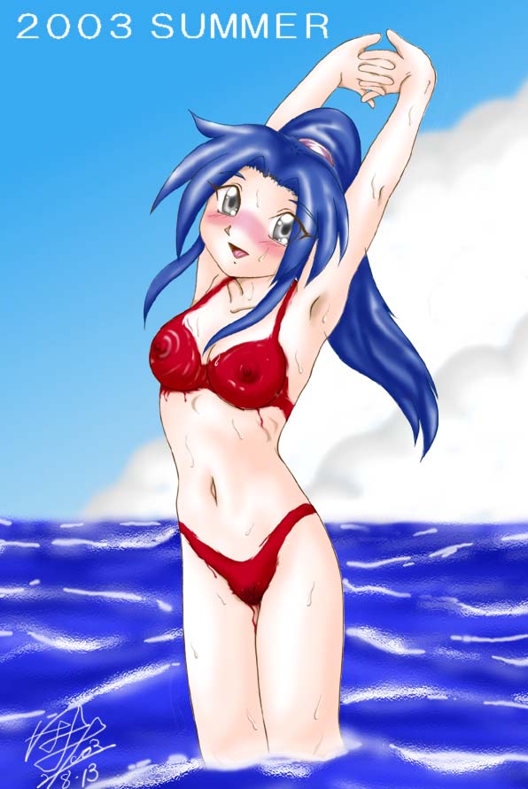 真夏のビーチで、なにやら妖しいポーズ。 かわいいお尻が丸見えになっています。 水着を脱いで、何をしようとしているのでしょうね♪ 木暮かおるさん、きれいな暑中御見舞いCGを贈ってくださり、ありがとうございます。 |