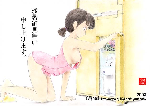 なにやら、無防備な女の子が、冷蔵庫の中を物色中ですね。 でも、その中にいたのは・・・なんでしょう?(笑) シャツを押し上げているかわいらしいおっぱいがなんともいえませんねぇ。 ようはちさん、かわいらしい暑中御見舞いをいただき、ありがとうございます。 |