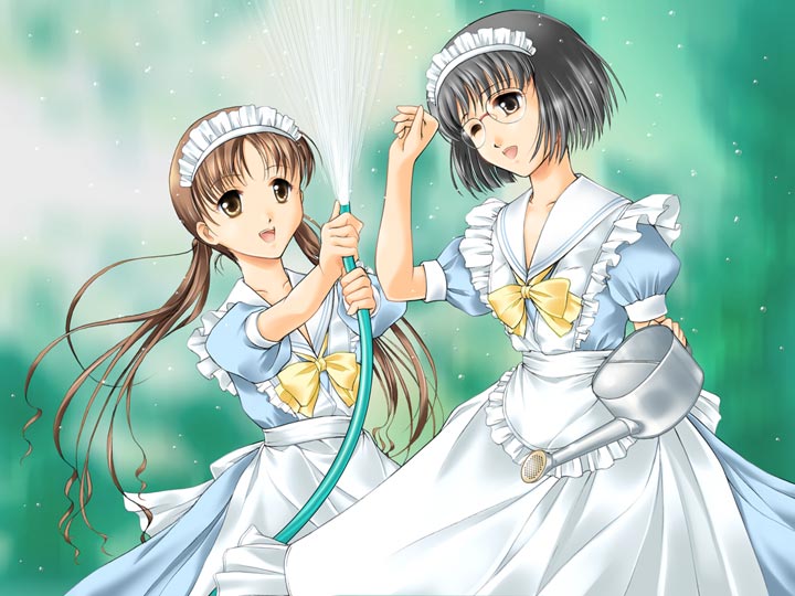 2人のメイドさんがお庭で水遊びの真っ最中。 きっちり着込んだセーラータイプのメイド服に涼しげな水しぶきが降りかかる姿がかわいらしく和みます。 でも、お仕事の方はなかなか進まなそうですね。 萱津たいらさん、かわいらしい残暑御見舞いをいただき、ありがとうございます。 |