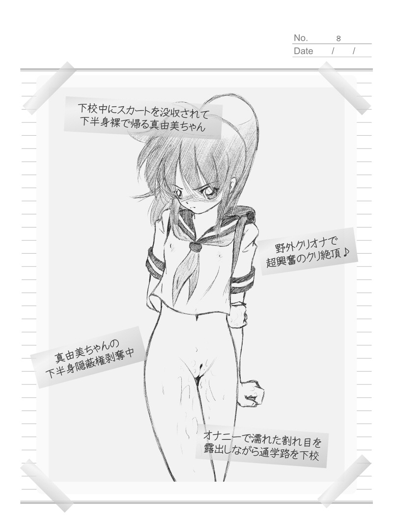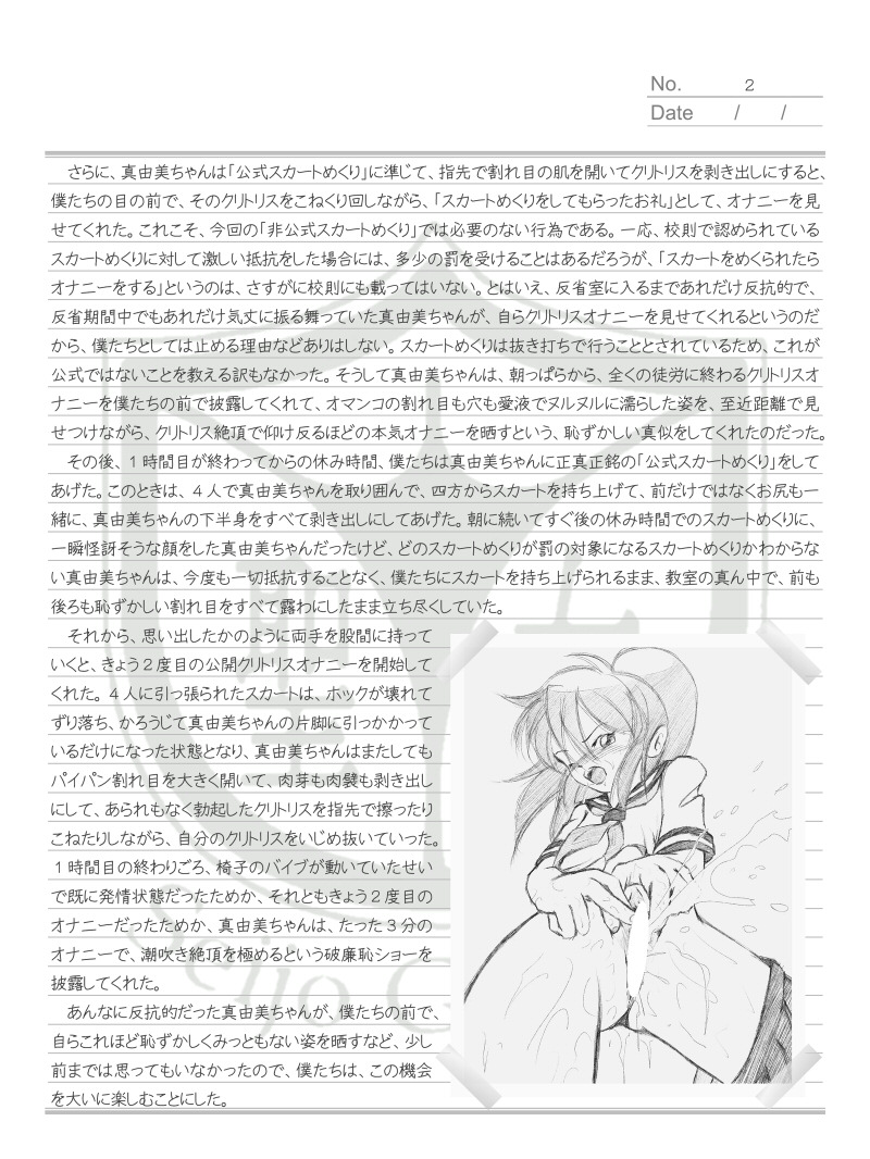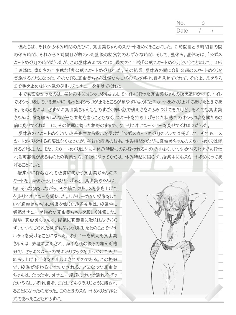 したがって、違いを見分ける術のない真由美には、すべての「スカートめくり」に対して、同じように対応――すなわち、割れ目を開いてクリトリスオナニー絶頂を見せるという、恥辱の行為を何度も繰り返すということを、せざるを得ないのだった。