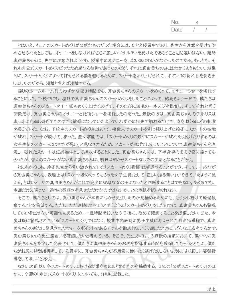 しかし、この日に行われる「スカートめくり」のうちいずれかはこの玲子の指示による「公式スカートめくり」であり、もし、その「公式スカートめくり」がなされたときに、真由美が玲子が提示した条件をクリアしていなかった場合には、きつい罰を受けることは必至である。