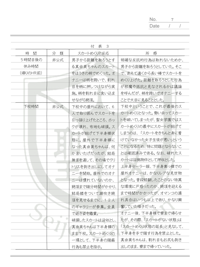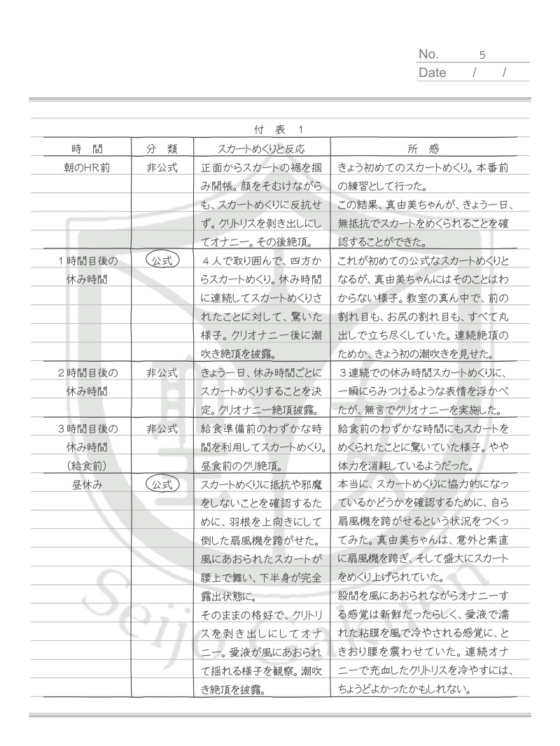 しかし、この日に限っては、「公式スカートめくり」と「非公式スカートめくり」は明確な差があり、「公式スカートめくり」をされたときには、玲子が提示 した条件のとおりに対応しなければならないのだが、「公式スカートめくり」と「非公式スカートめくり」の違いは、真由美には全くわかりようがない。