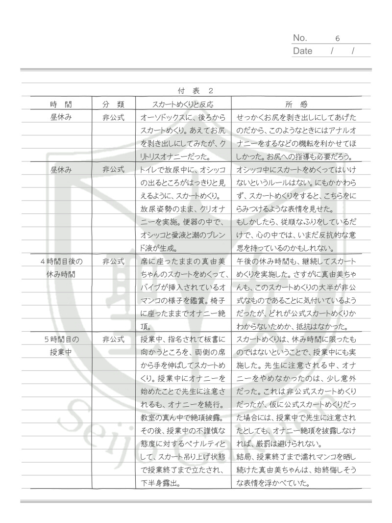 ただし、その学園公認で行われる確認のための「公式スカートめくり」は、真由美に対して抜き打ちで行うことが公言されており、協力者である男子生徒が、いつ、どこで、何回、その「公式スカートめくり」をするかは一切知らされていない。