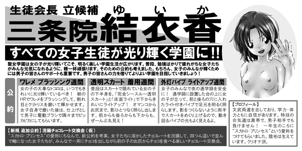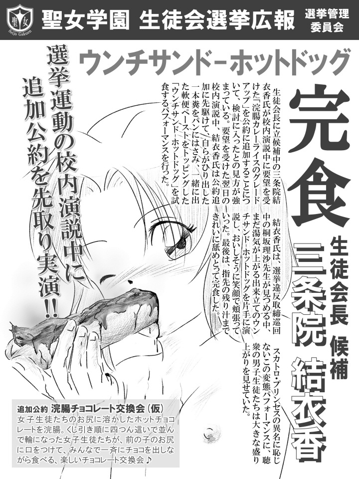 それは、生徒会長立候補者である結衣香が追加公約である「浣腸チョコレート交換会(仮)」のイベント企画を発表したことと、それにともなうPR活動とし