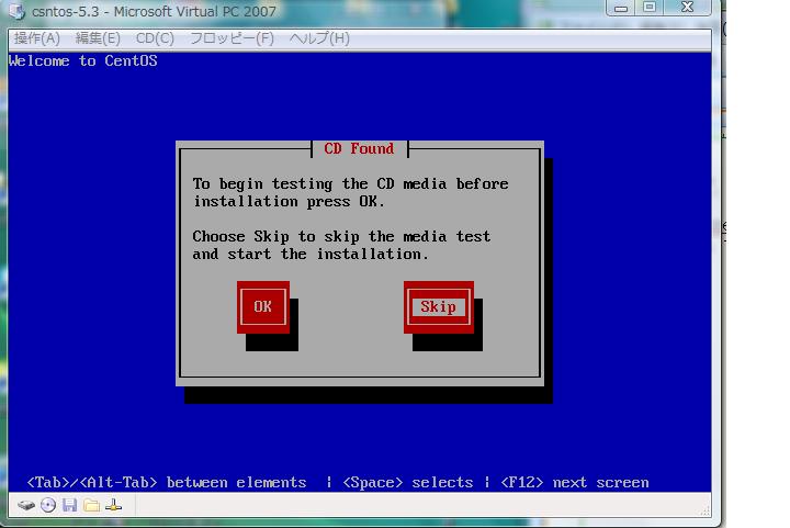 | ISOイメージのチェックは省略するので、「Skip」を選択します。 | |||||||||