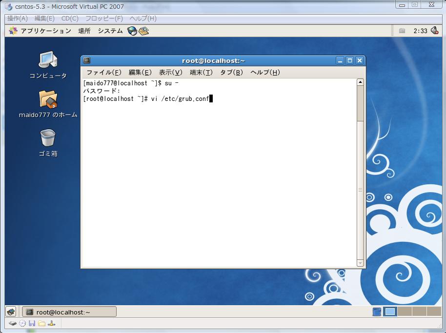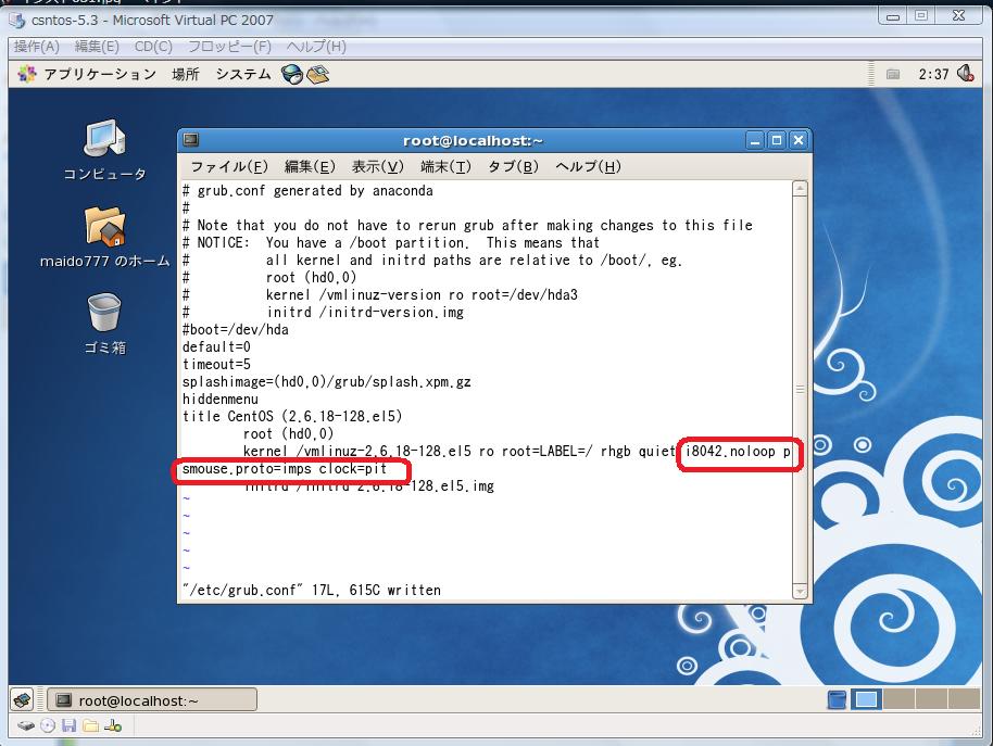 | ”kernel”の行に⇒i8042.noloop psmouse.proto=imps clock=pit を追加 |