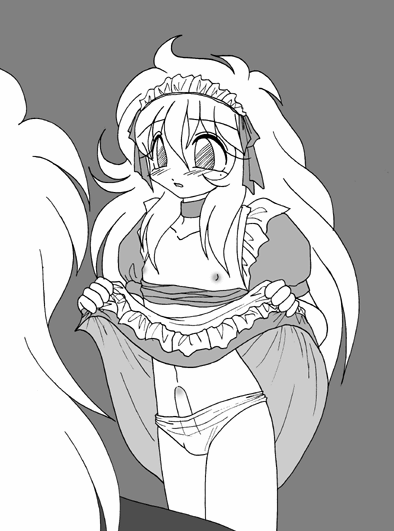服のシワが上手く描けないので変になってしまいました。 スカートをめくり上げるのは難しいです。 腰が細すぎたなぁ。 性器描写はリアルに描けません。 ご主人様はもちろんサガです。 メイドなアフロはご主人様の命令に絶対服従。