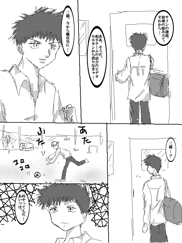 サッカーボールがしまい忘れてて、それを三橋が拾って片付けに行く。