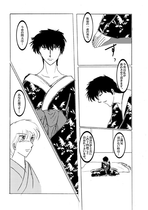 裏漫画TOPに戻る Back 初夜編前編でした! もっとじっくり描こうと思ってたのですが、ちょこっと手を抜いてしまいました…(;´Д`) これから初夜に突入です。 でも、女なんて抱いた事も無い総悟。 百戦錬磨の十四朗太夫を満足させられるだろうか!(笑) そんな初心な総悟たん。その内どんどん鬼畜になって行きますがね。(くす) まずはキスの仕方から教えましょうか。(笑) 資料によりますと、初見で一夜を過ごす事は殆どないそうです。 大体が3回目。それも余程気に入られないと2回目で振られるんだとか。 それに、茶店の紹介がないと初見すら受け付けてくれないそうですよ。 プライドの高い花魁。まさに十四朗ですなぁ。(くす) ……お後が宜しい様で…Σ(; ̄□ ̄A アセアセ 最後までお使いありがとうございました!