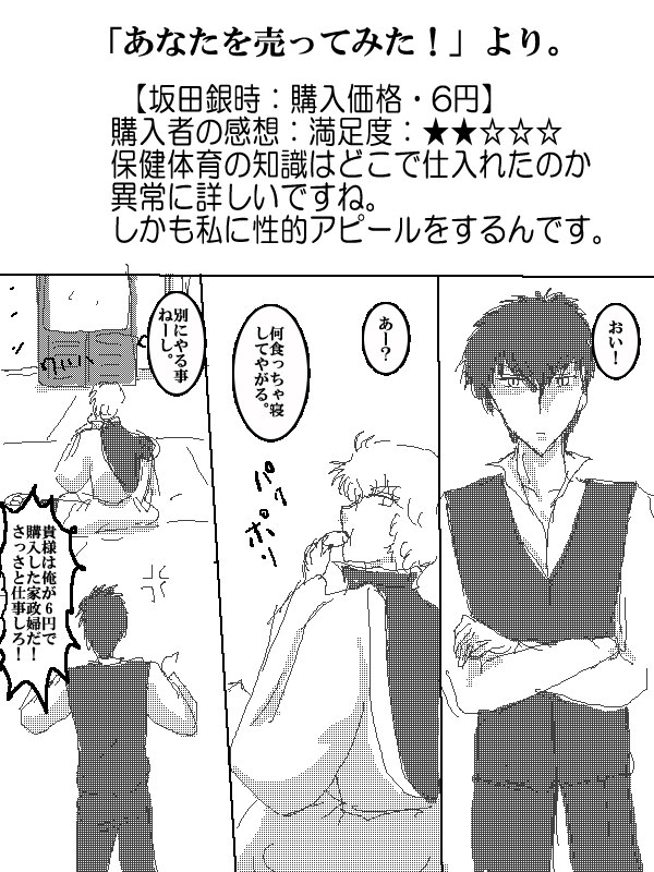 裏漫画TOPに戻る Next Twitterの診断マーカーで「あなたを売ってみた」を「坂田銀時」でやってみました! そうしたら、6円で購入され、しかも保健体育の知識が以上に詳しいと出たもんだ! それはもう、副長に買って貰うしかないと書き下ろしました! しばしお付き合い下さいませ!