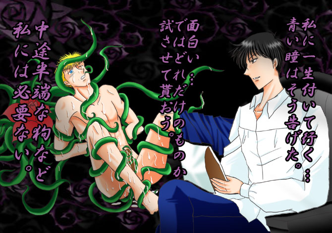 なんだかシリーズ物になってきましたが…(苦笑) やはりジンカイ繋がりで知り合ったガテンさんからのリクエストでロイハボを。 ロイハボじゃないですね。触手×ハボ+ロイ視姦ですか。(悦) 最近腐女子になりつつあるガテンさん。 これで腐女子の修行をするんだとか。 出来るか!?!?(笑) 何だか「緑色の恋心」のワンシーンみたいに思えるのは気のせいか?(笑)