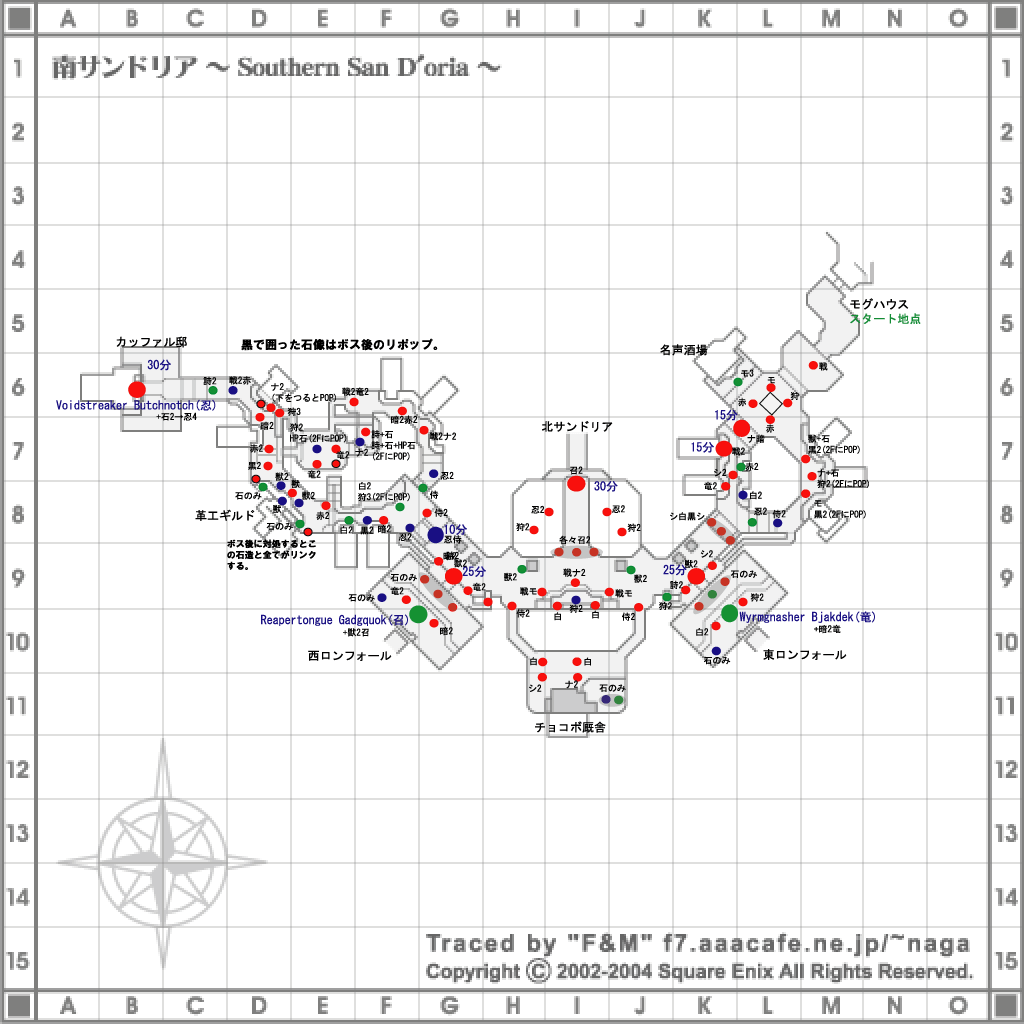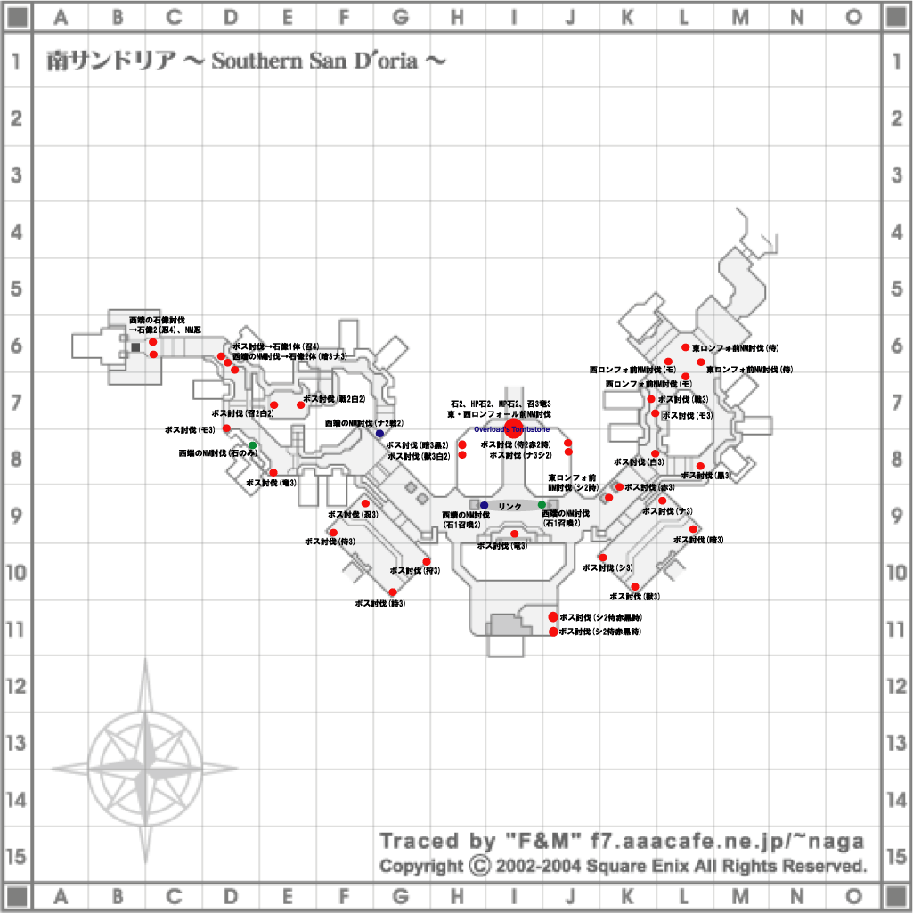 詳細データ ○時間延長 ・モグ前噴水広場出口の石像 10分 ・武器屋前の石像 15分×2 ・東ロンフォ出口の門を出入りする石像 25分 ・北サンドリア前の石像 30分 ・西ロンフォ出口の門を出入りする石像 25分 ・西ロンフォ出口付近(G-8)の階段にいる石像 10分 ・カッファル邸前の石像 30分 以上、初期60分+延長150分+ボス0分=合計210分 このエリアでボスによる延長はありません。 ○ボスPOP条件------ボス名:Overlord's Tombstone 東ロンフォール門前の Wyrmgnasher Bjakdek(竜騎士) 西ロンフォール門前の Reapertongue Gadgquok(召喚士) の撃破 ○MAPデータ (クリックするとそのまま表示、「右クリック」→「対象をファイルに保存」でお持ち帰りできます。)