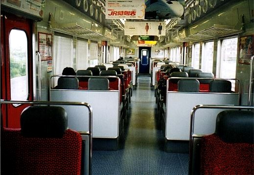 車内は、811系があたりさわりのない”電車”としての雰囲気であるのに対し、 扉は赤で原色、グレーの壁に、赤や青の原色に黒をちりばめたシートモケットなどと、 従来の近郊型電車のイメージを打ち破った内装となっています。