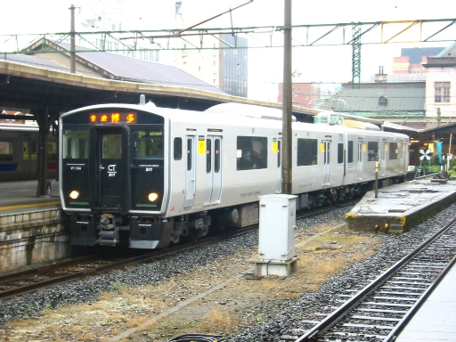 2001年10月、筑豊本線・篠栗線の電化開業と長崎本線ワンマン運転開始を機に 投入された系列。815系と同様日立Aトレインシステムを踏襲し、アルミ製の筒に 妻板でフタをしたような車体構成となっています。815系をベースとしていますが、 車内は885系でも採用された白壁に白木を使用した座席を配置しています。また、 運転席側の運転室窓が拡大されております。これは前面がガラス張りとなって 保安対策の強化が必要となったようで、815系に比して運転席が拡大しています。車内は用・個・美をコンセプトとしています。用とは用途に応じた車内構成、 つまり広く取った踊り場や増加したつり革などを指します。また、個は一人一人の 居住性の改善、つまり木を使用した座席や一人掛けの補助席などがこのコンセプトから 生まれたとのことです。美とは特に”用”や内装などを美しく配置、配色することとしたもので、 サークル状に配置された吊革や白にドットを配置した床材、黒とシルバーのモノトーンな 外装などにその片鱗を見せています。 実際、バリアフリー法への対応策として通路幅を確保(82センチ)、踊り場を広く取りました。 これはアルミ押し出し材によって車体外板の強度を保ちつつ、効果的に厚さを減じることに 成功したことが大きく貢献しています。