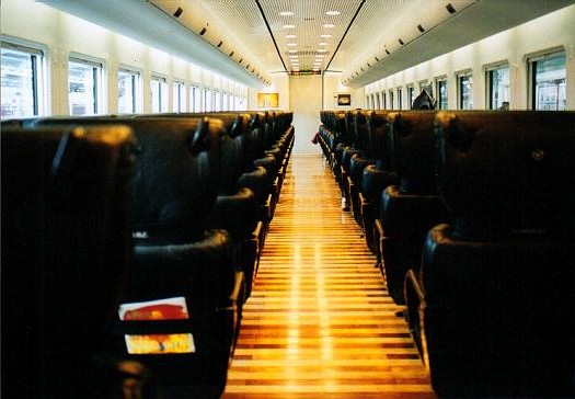 座席設備はレザーシートを採用したという点では画期的でしたが、全体的に華奢な印象は 拭えず、6号車(喫煙車)の灰皿がもげていたり、肘掛に内蔵されているテーブルの出し方が 分からない、足載せがない、床の木が黒ずんでいる、などのマイナス点も指摘されています。 また、客室の扉は、障子をイメージしたガラス戸なのですが、混雑時に頻繁に開閉しないよう 考慮した結果でしょうか、自動扉の作動がやや遅く、勢い余って体当たりしたのか、ヒビが 入った状態の車両を見たこともあります。難しいところですね。