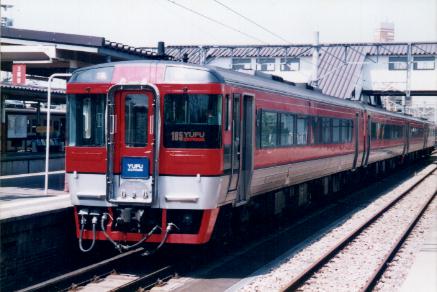 これが現在の特急あそ、ゆふです。車両は国鉄末期の昭和60年に登場しました。 四国で昭和47年以来活躍し、老朽化してきたキハ181系を置き換える目的で、 瀬戸内の潮風に強いステンレスの車体を持って登場しました。