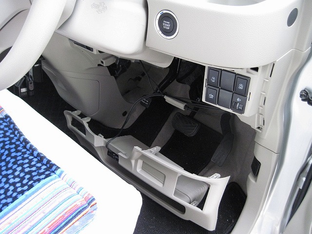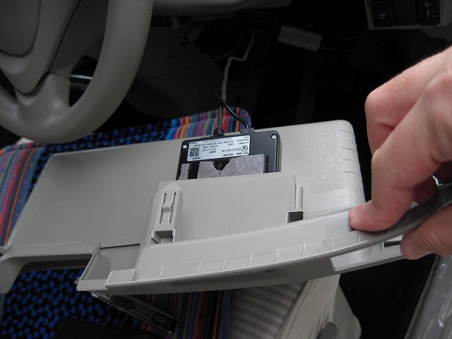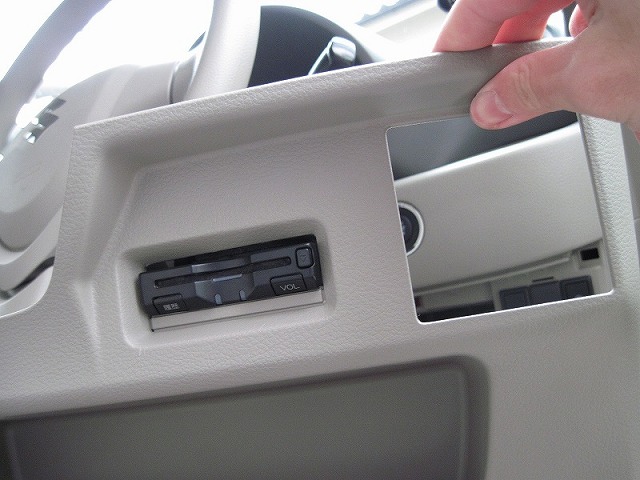 嫁さんのツテで買ったこの車、パネルにキズを入れたりしたくないからか、ETC車載器は、パネルに とめてあるだけで、スペースがつぶれるので、ビルドインにしました。パネルは手前方向に引っ張るとバキョバキョ 外せます。