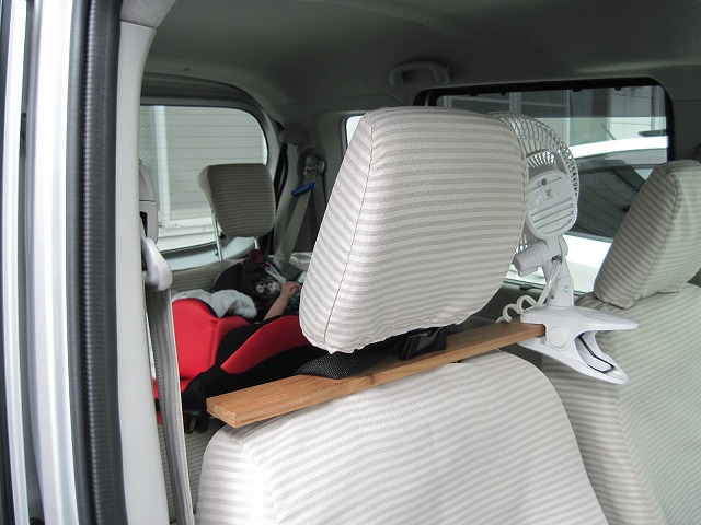 扇風機は角材に穴を開けて取り付けます。鹿児島中央駅前ジオラマ用の モジュールを作る過程で、45ミリ×10ミリ×600ミリの 角材が余っていたのでヘッドレストの幅に合わせて 13ミリの穴を開けます。首に当たる可能性は低いのですが、念のため 中心線ではなく5ミリ後方に開けてあります(45ミリ幅の角材の22.5ミリ位置ではなく、 20ミリと25ミリの間にして、25ミリ側が後方です)。