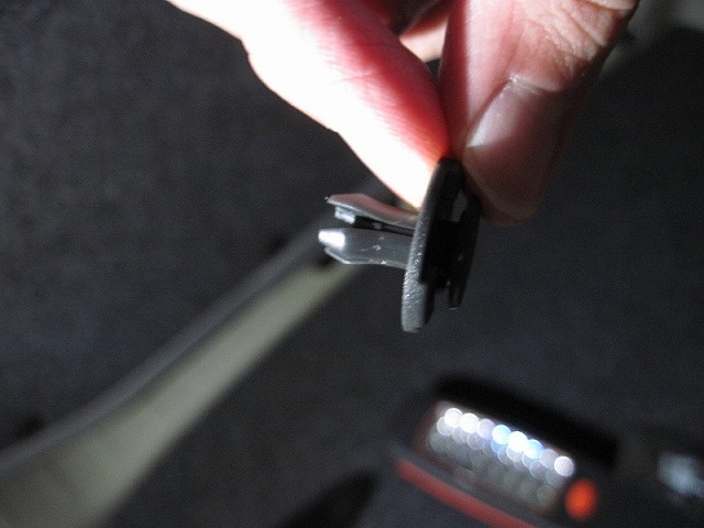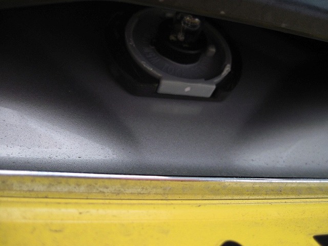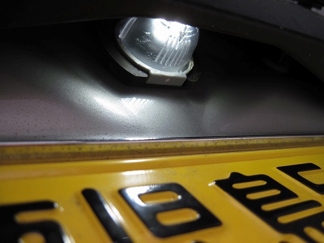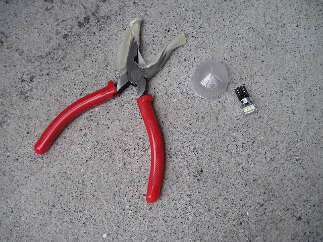 ライセンスプレートランプのカバーは硬いので注意してください。ヤットコに マスキングテープで傷をつけないようにして外しました。ひねって外した後です。