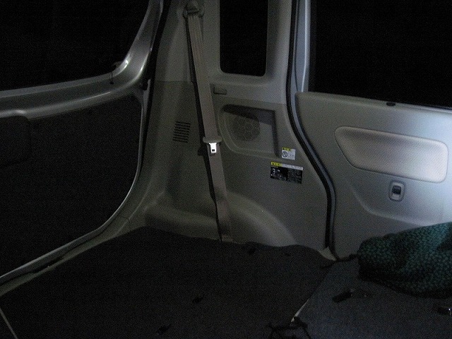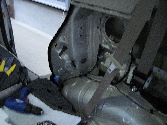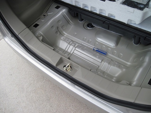 リア側。パンク修理キットを外し、プッシュリベットを外します。 リアゲートの左右に渡されている樹脂パーツを外さないと、スピーカー部分の パネルが外せません。