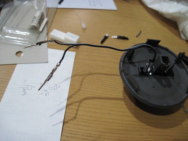 接続用のコネクタは別途購入。規格は・・・040型。メス端子側カプラキット、 F040/2P040K-Fだっけ?配線コムで購入。 本体側、白がプラス、青がマイナス、だったはず。