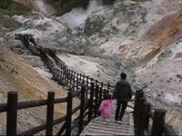 | 9:00にホテルを出発し、まずはホテルから5分の地獄谷へ!! 地獄にちなんでか登別の温泉街には鬼がたくさんいます。 ![]()